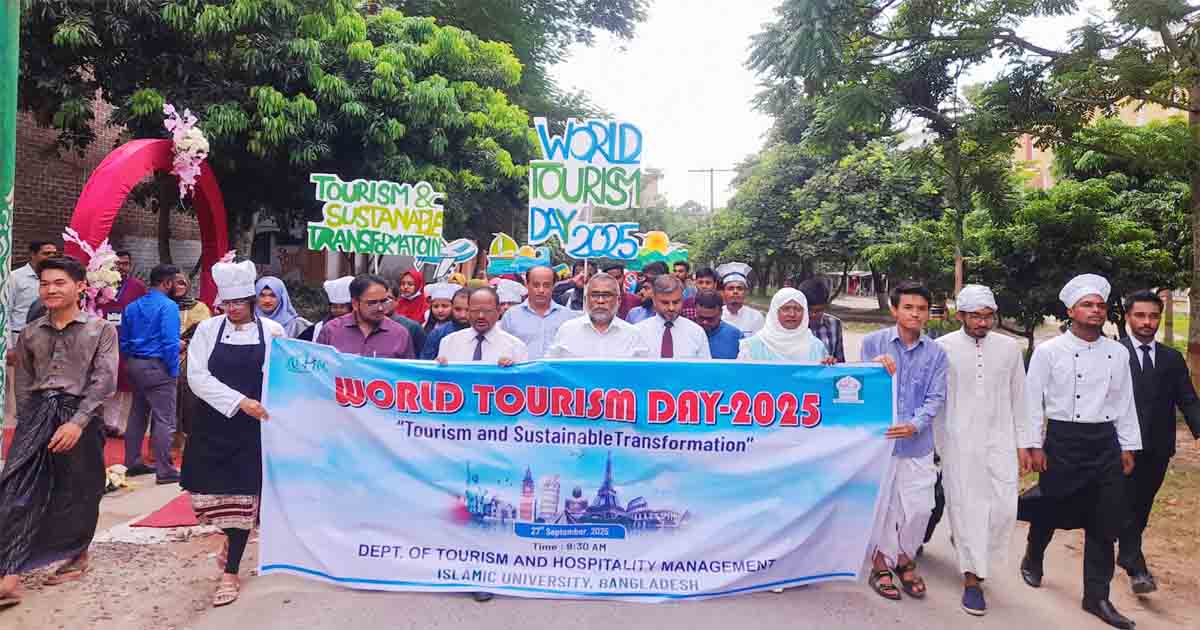 ‘ট্যুরিজম অ্যান্ড সাস্টেইনেবল ট্রান্সফর্মেশন’ প্রতিপাদ্যে ইসলামী বিশ্ববিদ্যালয়ে (ইবি) বিশ্ব পর্যটন দিবস পালিত হয়েছে। শনিবার দুপুরে ট্যুরিজম অ্যান্ড হসপিটালিটি ম্যানেজমেন্ট বিভাগের আয়োজনে ব্যবসায় প্রশাসন অনুষদ ভবনের সামনে শান্তির প্রতীক পায়রা উড়িয়ে অনুষ্ঠানের উদ্বোধন করেন উপাচার্য অধ্যাপক ড. নকীব মোহাম্মদ নসরুল্লাহ। এসময় উপস্থিত ছিলেন উপ-উপাচার্য অধ্যাপক ড. এম এয়াকুব আলী, কোষাধ্যক্ষ অধ্যাপক ড. জাহাঙ্গীর আলম, ব্যবসায় প্রশাসন অনুষদের ডিন অধ্যাপক ড. শেলীনা নাসরীন ও বিভাগটির সভাপতি সহকারী অধ্যাপক শরিফুল ইসলামসহ বিভাগের অন্যান্য শিক্ষক ও শিক্ষার্থীরা।