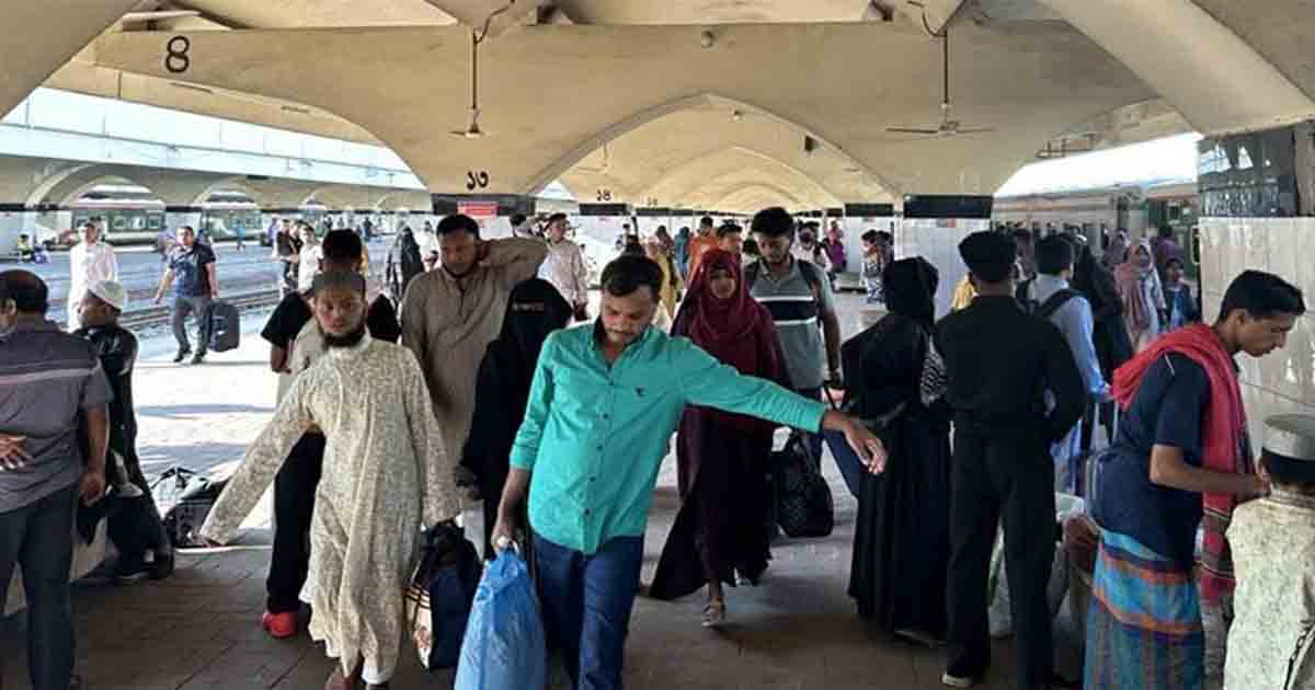 কমলাপুর রেলওয়ে স্টেশনেও ছিল একই চিত্র। প্রতিটি ট্রেনই ছিল যাত্রীতে ঠাসা। বিশেষ করে আন্তঃনগর ট্রেনগুলোতে তিল ধারণের ঠাঁই ছিল না।