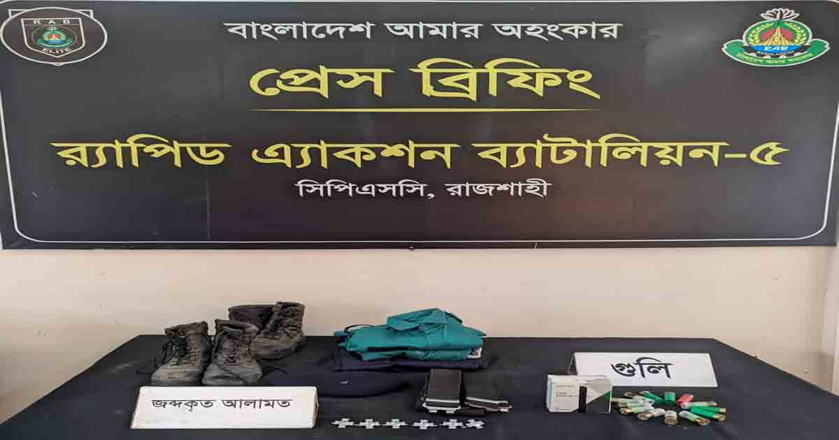 রাজশাহী মহানগরীর কাশিয়াডাঙ্গা থানা এলাকা থেকে গত ৫ আগস্ট ২০২৪ সালে লুণ্ঠিত পুলিশের শর্টগানের ১৩ রাউন্ড তাজা গুলি, পুলিশের পোশাক ও বিভিন্ন সরঞ্জাম উদ্ধার করেছে র্যাব-৫।