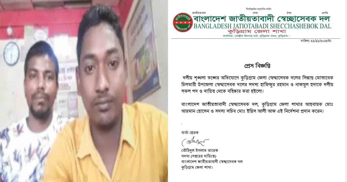 এক প্রেস বিজ্ঞপ্তিতে বলা হয়েছে, দলীয় শৃঙ্খলা ভঙ্গের অভিযোগে কুড়িগ্রাম জেলা স্বেচ্ছাসেবক দলের সিদ্ধান্ত মোতাবেক চিলমারী উপজেলা স্বেচ্ছাসেবক দলের সদস্য মোঃ হাফিজুর রহমান ও মোঃ নাজমুল হুদাকে দলীয় সকল পদ ও দায়িত্ব থেকে বহিষ্কার করা হইলো। বাংলাদেশ জাতীয়তাবাদী স্বেচ্ছাসেবক দল, কুড়িগ্রাম জেলা শাখার আহবায়ক মোঃ আরমান হোসেন ও সদস্য সচিব মোঃ ইদ্রিস আলী আজ এই নির্দেশনা প্রদান করেন।