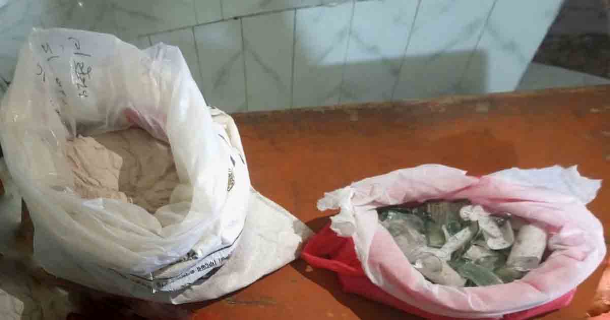 পরে ব্যাগটি তল্লাশি করে উদ্ধার করা হয় ১২ কেজি ৫৮০ গ্রাম বিস্ফোরক সদৃশ গান পাউডার এবং ২ কেজি ১৪০ গ্রাম ভাঙা কাঁচের গুঁড়া।