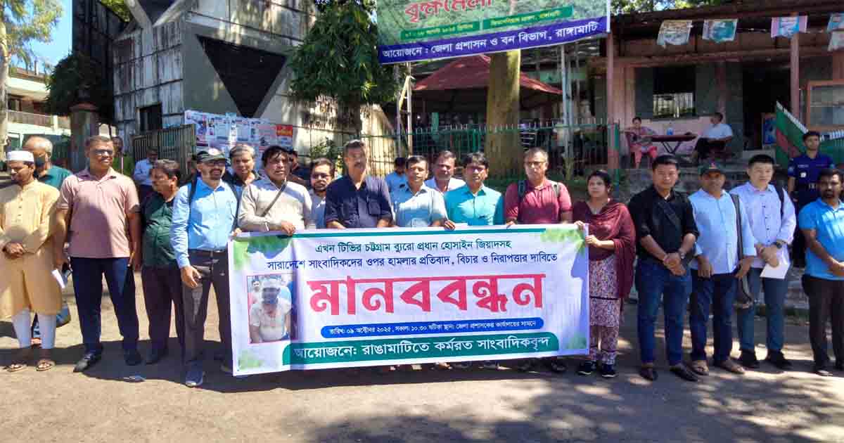 চট্টগ্রামের সলিমপুরে সংবাদ সংগ্রহ করতে গিয়ে এখন টেলিভিশনের চট্টগ্রাম ব্যুরো প্রধান ও বিশেষ প্রতিনিধি হোসাইন জিয়াদ ও চিত্র সাংবাদিক পারভেজ সহ সারাদেশে সাংবাদিকদের ওপর ন্যাক্কারজনক হামলার প্রতিবাদ, বিচার ও নিরাপত্তার দাবিতে রাঙামাটিতে মানববন্ধন কর্মসূচি পালন করেছেন কর্মরত সাংবাদিকরা।