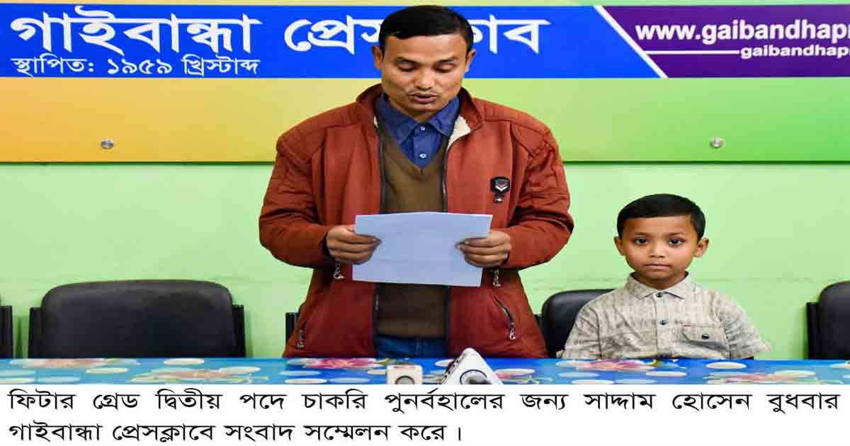 ফিটার গ্রেড দ্বিতীয় সাদ্দাম হোসেনকে চাকরিতে পুনর্বহালের জন্য বিভাগীয় রেলওয়ে ব্যবস্থাপক (লালমনিরহাট) নির্দেশ দিলেও এস.এস.এ.ই/আইসি/টিএক্সআর রায়হানুল ও ক্যারেজ অ্যান্ড ওয়াগন অফিসের উচ্চমান সহকারী আনোয়ার হোসেন তা অমান্য করছেন। ফলে সাদ্দাম হোসেন চাকরিতে যোগদান করতে না পেরে চরম আর্থিক সংকটে মানবেতর জীবনযাপন করছেন। গাইবান্ধা প্রেসক্লাবে বুধবার আয়োজিত এক সংবাদ সম্মেলনে এ তথ্য জানান ভুক্তভোগী সাদ্দাম হোসেন।