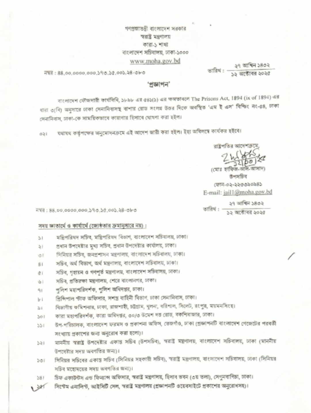 উপসচিব মো. হাফিজ-আল-আসাদের সই করা ওই প্রজ্ঞাপনে বলা হয়, বাংলাদেশ ফৌজদারি কার্যবিধি, ১৮৯৮ এর ৫৪১(১) এর ক্ষমতাবলে The Prisons Act, 1894 (ix of 1894) এর ধারা (বি) অনুসারে ঢাকা সেনানিবাসের বাশার রোড সংলগ্ন উত্তর দিকের ‘এমইএস’ বিল্ডিং নম্বর-৫৪ কে সাময়িকভাবে কারাগার হিসাবে ঘোষণা করা হলো।