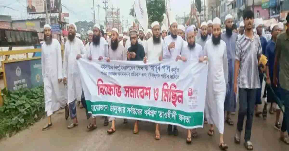 নর্থ সাউথ বিশ্ববিদ্যালয়ের শিক্ষার্থী অপূর্ব পাল কর্তৃক পবিত্র কুরআন অবমাননার ঘটনায় ক্ষোভে ফেটে পড়েছে ময়মনসিংহের ভালুকাবাসী। এ ঘটনার প্রতিবাদে মঙ্গলবার (৭ অক্টোবর) বিকেলে ভালুকায় বিক্ষোভ মিছিল ও সমাবেশ অনুষ্ঠিত হয়।