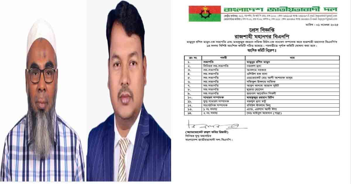 বাংলাদেশ জাতীয়তাবাদী দল (বিএনপি) রাজশাহী মহানগর শাখার আংশিক কমিটি ঘোষণা করেছে কেন্দ্রীয় নির্বাহী কমিটি। নবগঠিত কমিটিতে মামুনুর রশিদ মামুনকে সভাপতি এবং **মাহফুজুর রহমান (রিটন)**কে সাধারণ সম্পাদক হিসেবে দায়িত্ব দেওয়া হয়েছে।