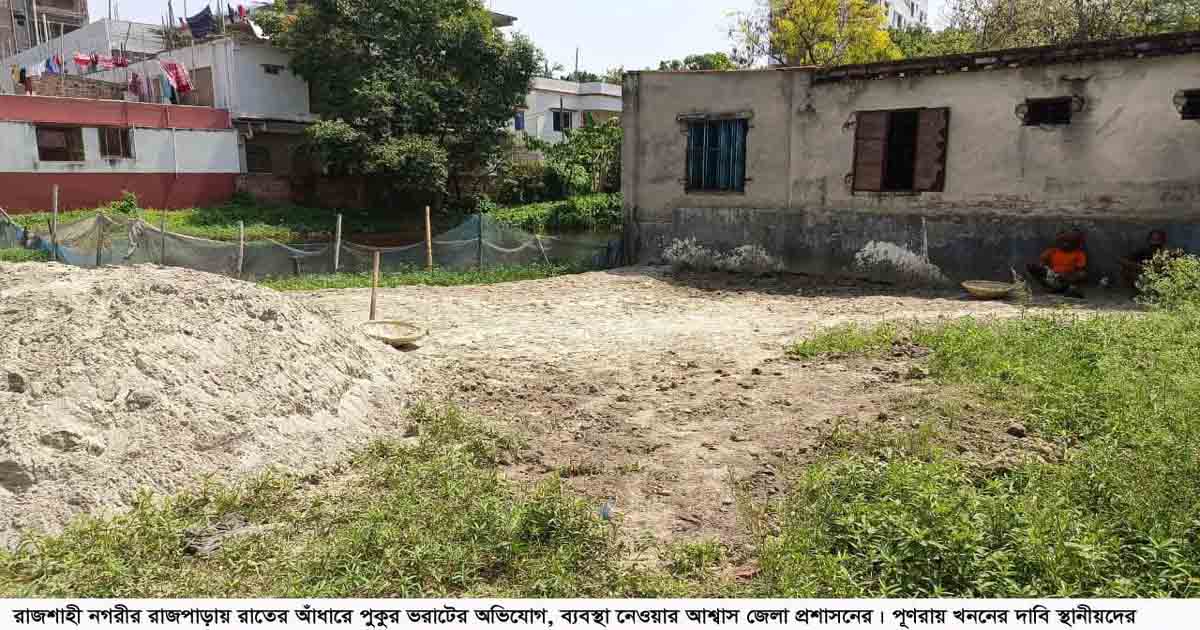 রাজশাহী মহানগরীর রাজপাড়া থানার লক্ষ্মীপুর ভাটপাড়া এলাকায় প্রশাসনের চোখ ফাঁকি দিয়ে রাতের আঁধারে একটি পুকুর ভরাটের অভিযোগ উঠেছে।