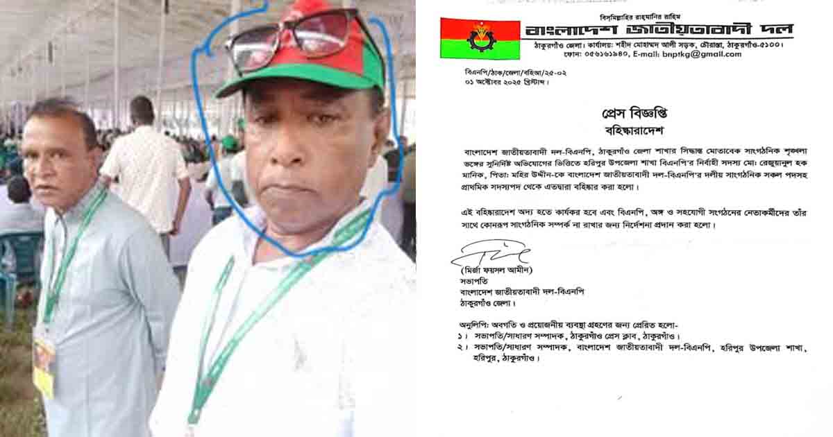 ১ অক্টোবর বুধবার বাংলাদেশ জাতীয়তাবাদী দল বিএনপি ঠাকুরগাঁও জেলা শাখার সভাপতি মির্জা ফয়সাল আমিনের এক পেশ বিজ্ঞপ্তিতে এই বহিষ্কারাদেশ থেকে জানা যায়।